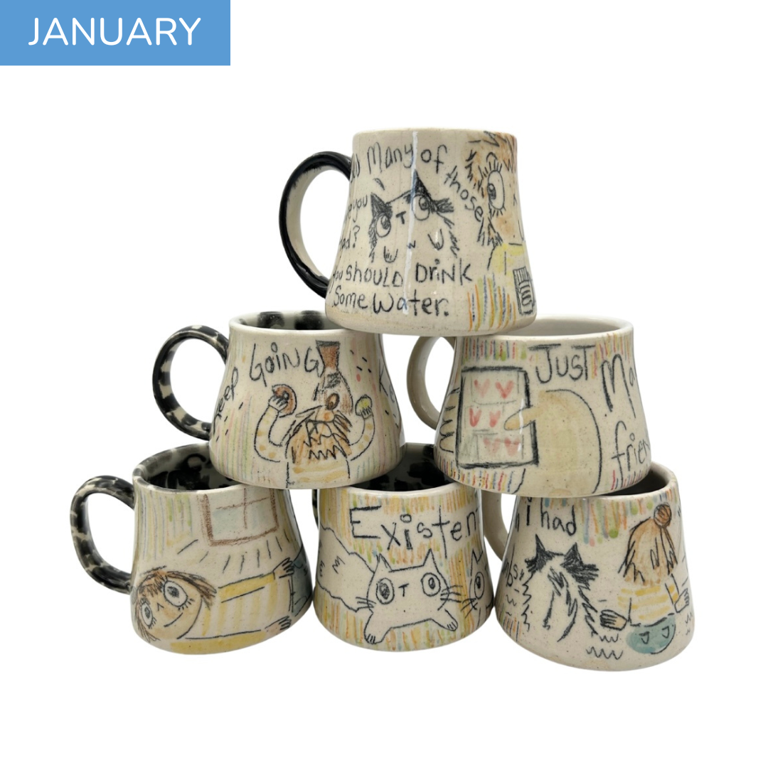 On day one, Laura will guide us through all things cartooning & creative imagery - taking 2D drawings and applying them to the 3D canvas of a ceramic cup. After rolling out slabs and constructing some basic cup shapes, we’ll dive in with guided drawing exercises to get the creative juices flowing, and to develop an artistic vocabulary to take with us through the workshop. Once our ideas are sketched out, students will learn to utilize sgraffito & inlay as techniques on our now-ready slab cups, creating a bold base for which we’ll translate our designs onto the clay using colorful underglazes and terra sigillata. Choose to add festive attachments, expressive handles, or anything else your mind can dream up to round out your imaginative original work of art!